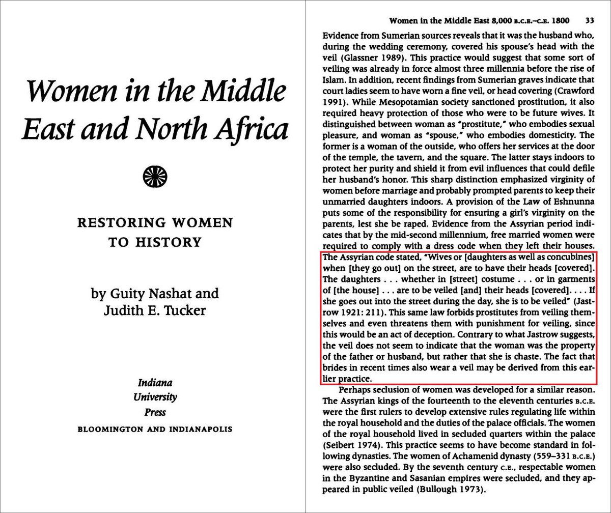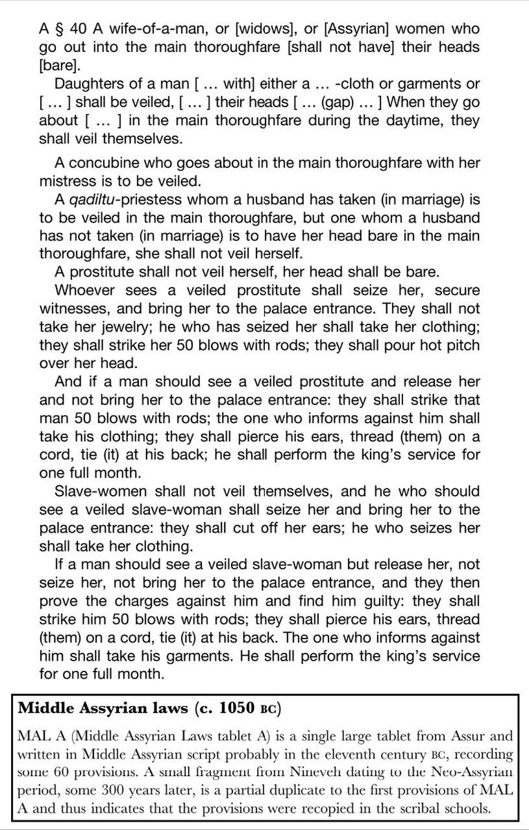 وكان ذلك ممنوعاً على الجواري والمومسات المرأة الحرة أو الشريفة فقط كان مفرووضا عليها أن تغطي شعرها ووجهها في آشور