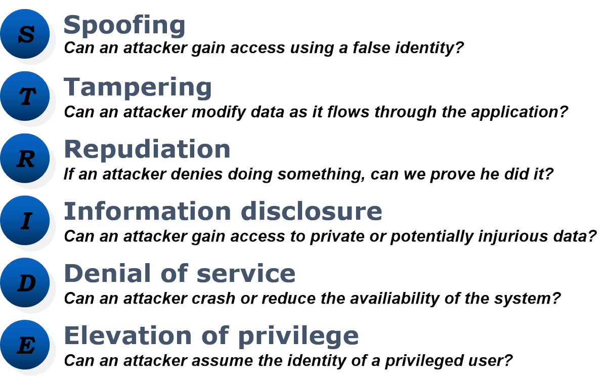 ايضا يتم الاستعانه ب #STRIDE موديل لجمع التهديدات بمسميات واضحه ومعرفه اشكالها و الانظمة التي ممكن ان تؤثر عليها ويتم تقييم التهديد من الاعلى خطر و حتى الاقل و التعامل معها اثناء بناء النظام لتقليل المشاكل والثغرات والتي يمكن ان تؤدي وتسهل عمليات الاختراق