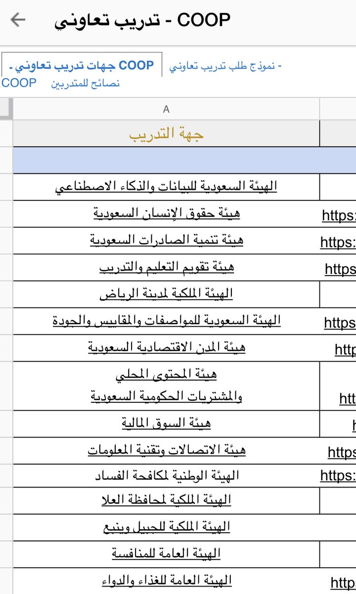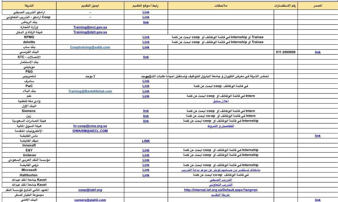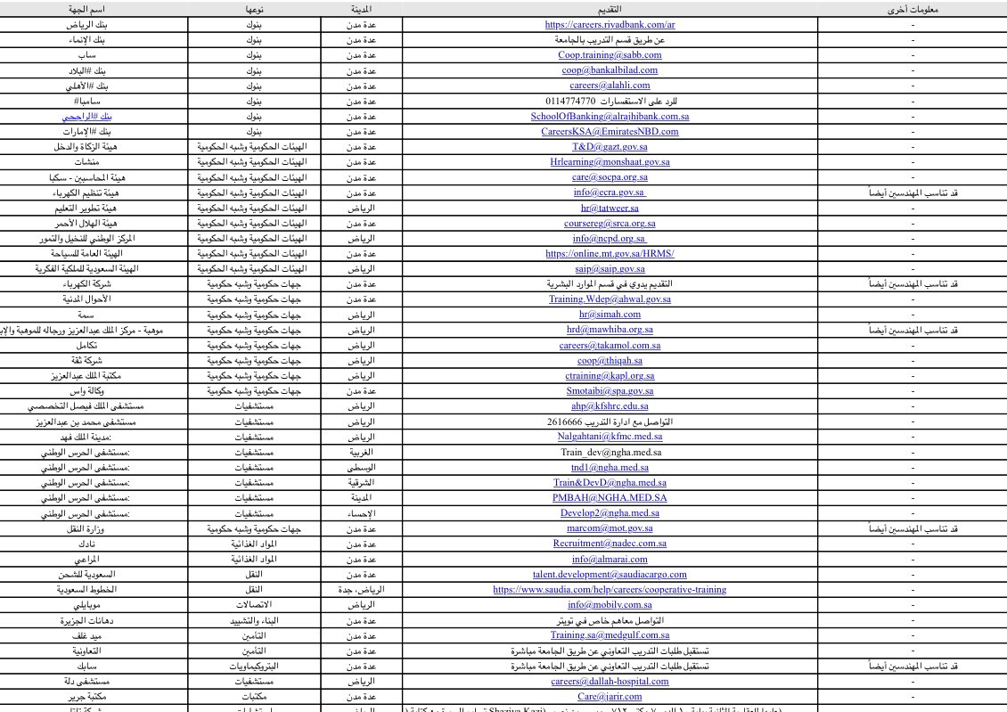 قائمة الشركات والجهات الحكومية للتدريب التعاوني بالإكسل👇🏻