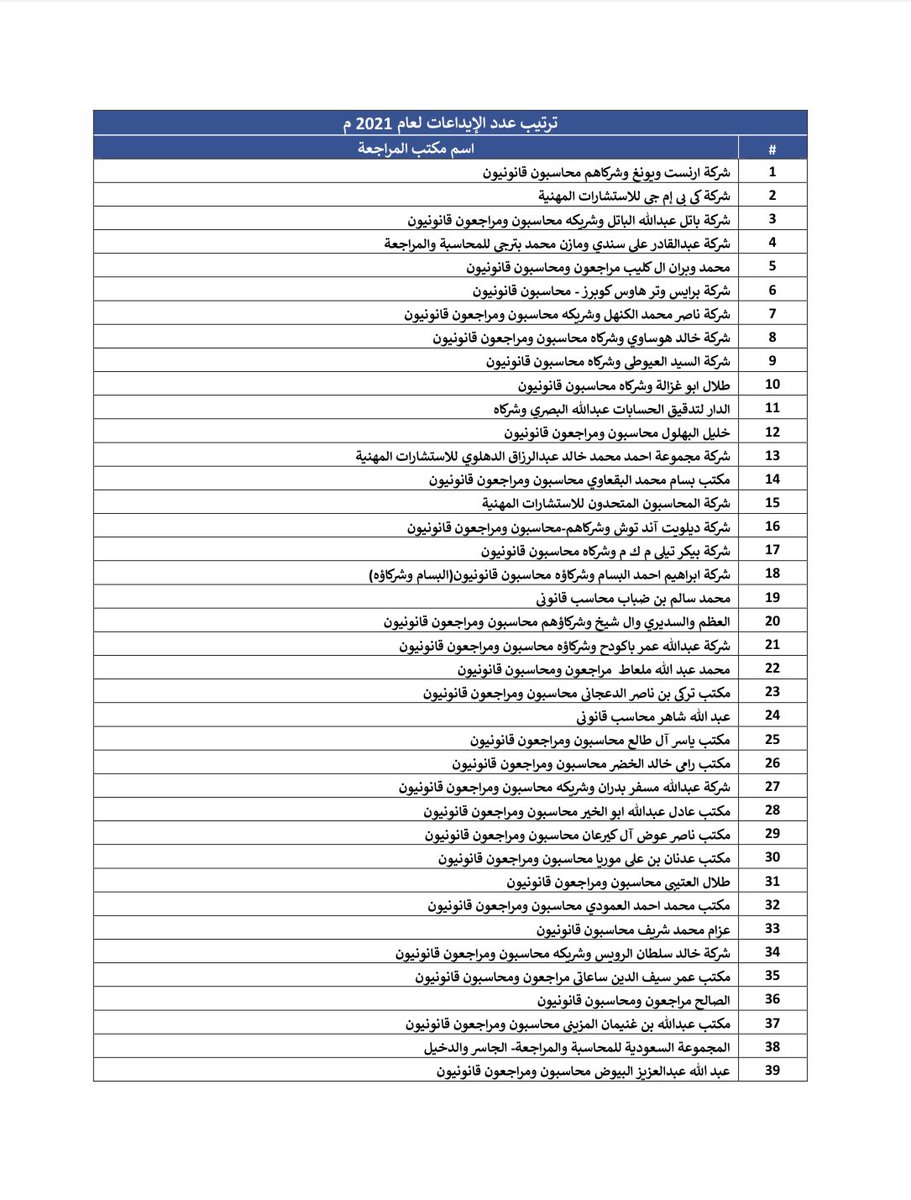 ملف ترتيب #مكاتب_المراجعة في المملكة العربية السعودية حسب عدد الإيداعات لعام 2021م.
