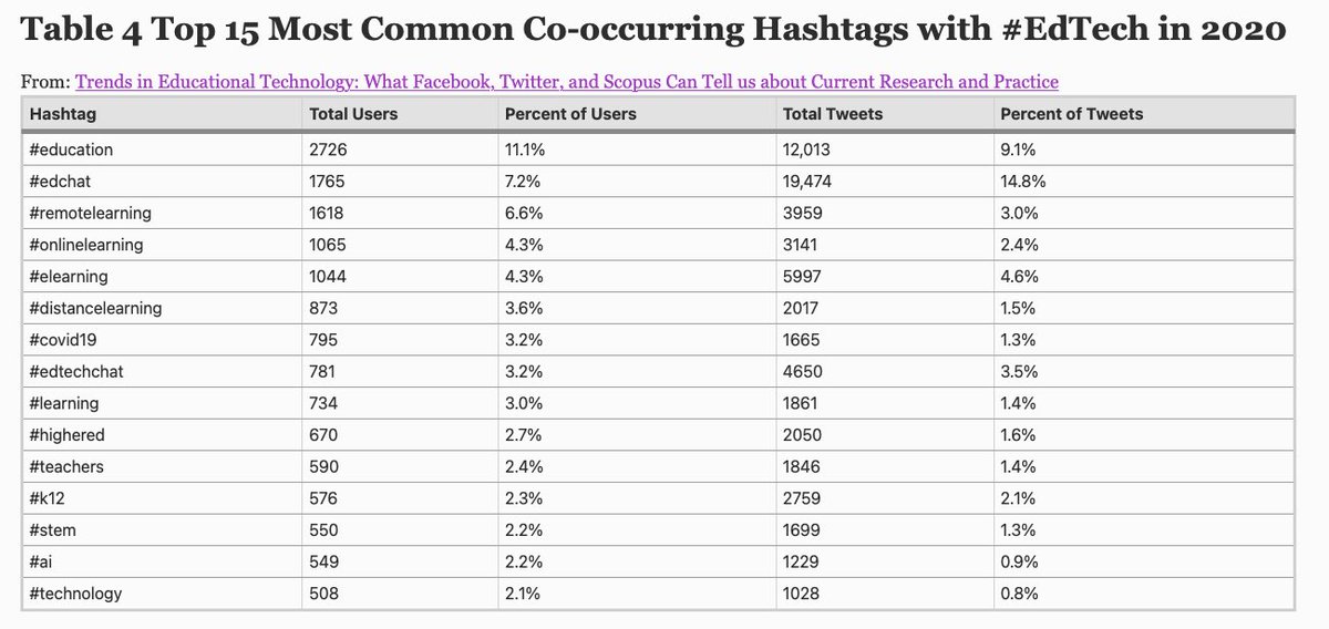 - نجد في الجدول ادناه اكثر الهاشتاقات المرتبطة بما يطرح في هاشتاق تقنيات التعليم اشهرهم #education, #edchat, #remotelearning
