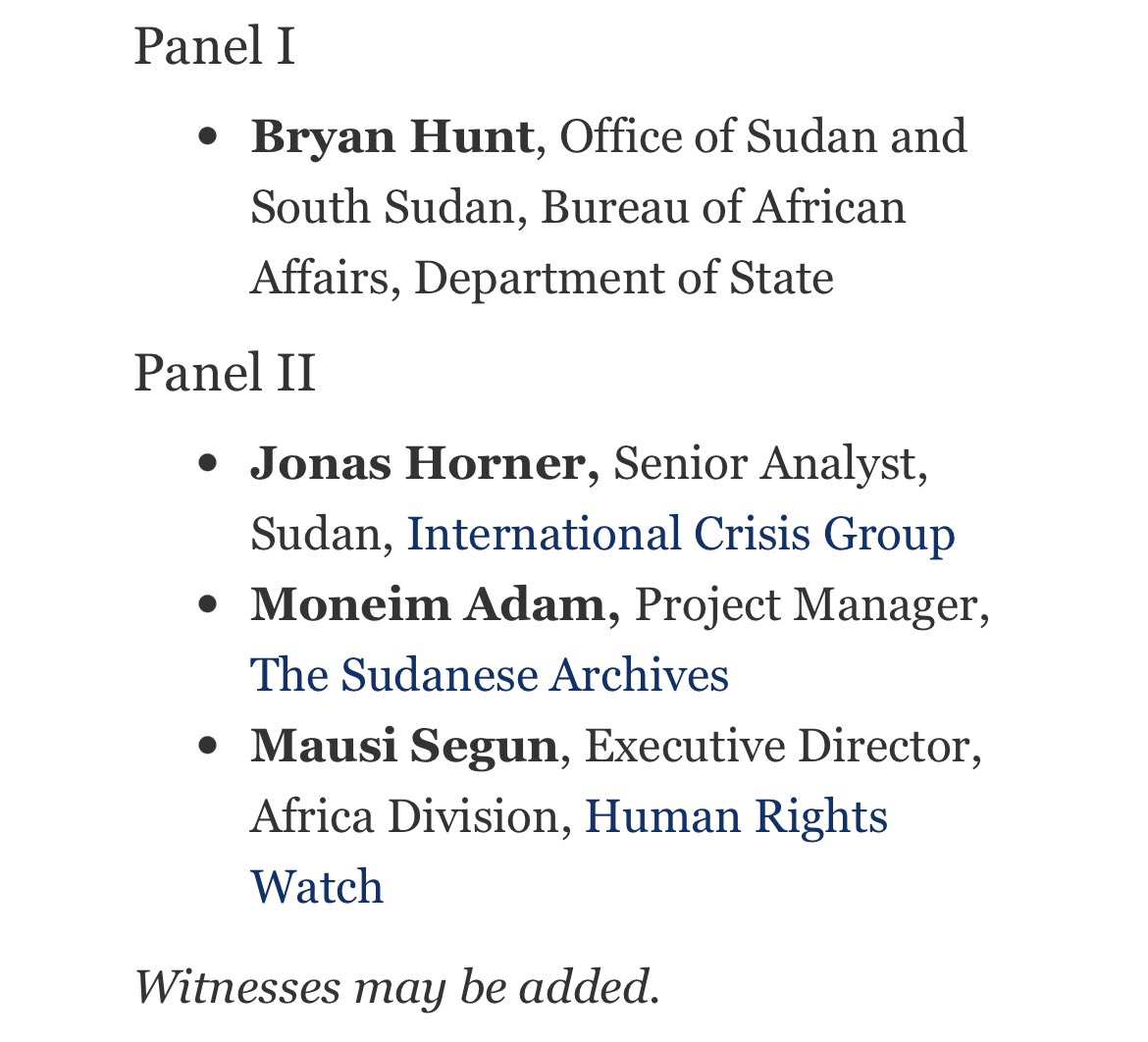 🚨 #السودان : يعقد اليوم الكونغرس اول جلسة استماع بعنوان "الانقلاب العسكري في السودان: انعكاساته على حقوق الانسان" - الجلسة تعقدها لجنة توم لانتوس لحقوق الانسان بحضور المسؤول في وزارة الخارجية براين هانت وتبدأ الساعة ٢ بتوقيت واشنطن (بعد ساعة من الان)- لائحة الشهود 👇🏻