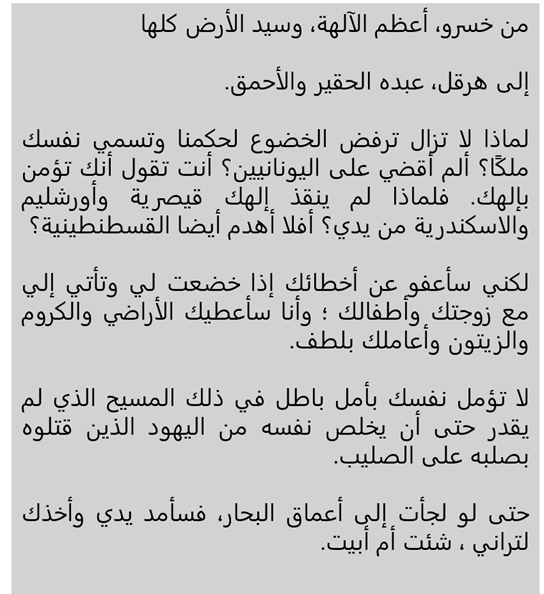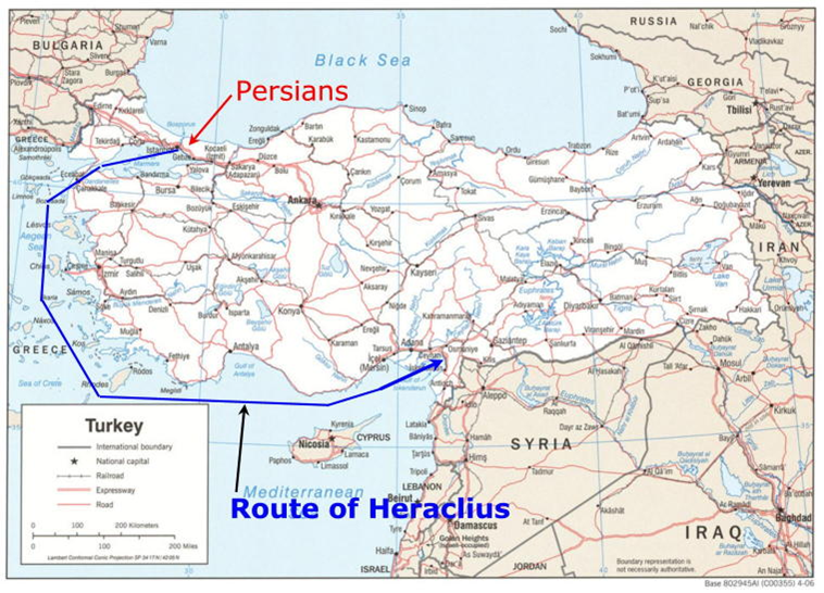 12. وفي 623م، قرر هرقل عمل ما لم يعمله أي إمبراطور رومي أو إغريقي منذ إسكندر الأكبر: قرر أن يغزو قلب إيران لسنتين وعاث فيها فسادا في ضوء تفرق الجيوش الفارسية. فوصل إلى مدينة مولد نبي المجوسية وحرقها وحرق معبدهم الأكبر انتقاما منهم لاحتلالهم لأورشليم.