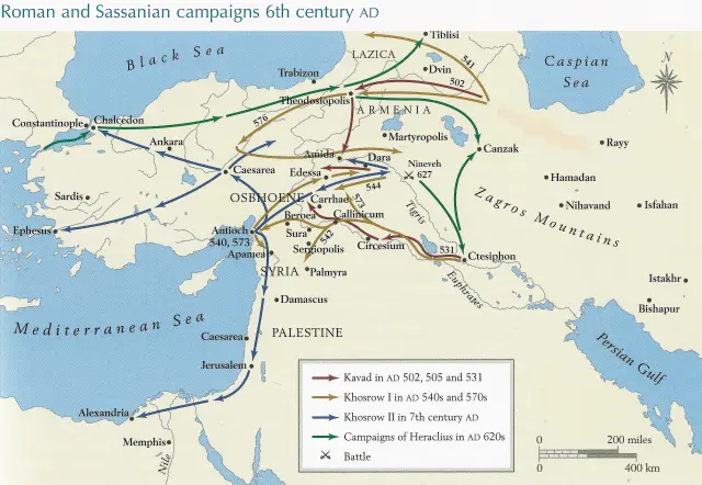 10. وعلى مضض، وافق هرقل على اتفاقية سلام مع الآفار ودفع فدية لكي يتفرغ للخطر الأكبر. ومن 620م إلى 622م كانت هناك مناوشات بسيطة ما بين الجيش الرومي والفارسي في المناطق المحيطة بالعاصمة. ولكن بعدها بدأ الجد الرومي.