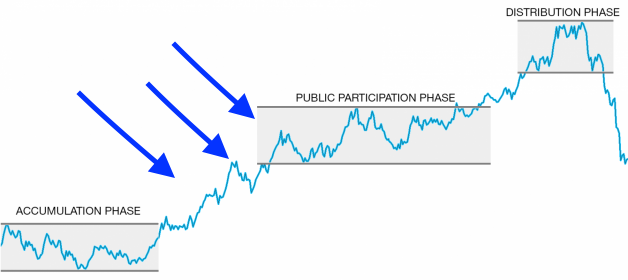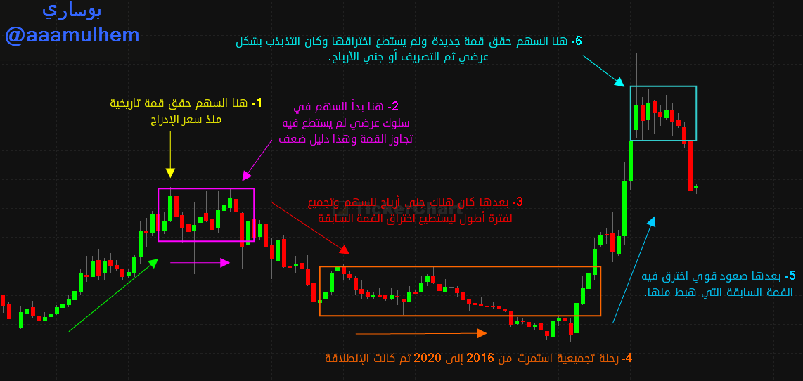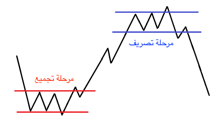 ١/ عادةً ماتكون مراحل التجميع والتصريف بشكل تدريجي وتسلك سلوكاً يتذبذب فيه المؤشر بشكل عرضي حتى لا يلاحظها المتداول البسيط وقد تستمر لفترات طويلة حسب الشركة و بنية الرسم البياني فيها.