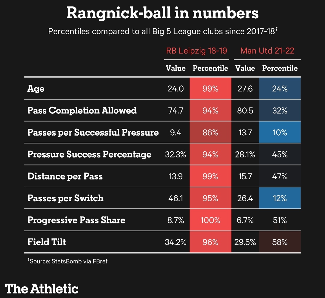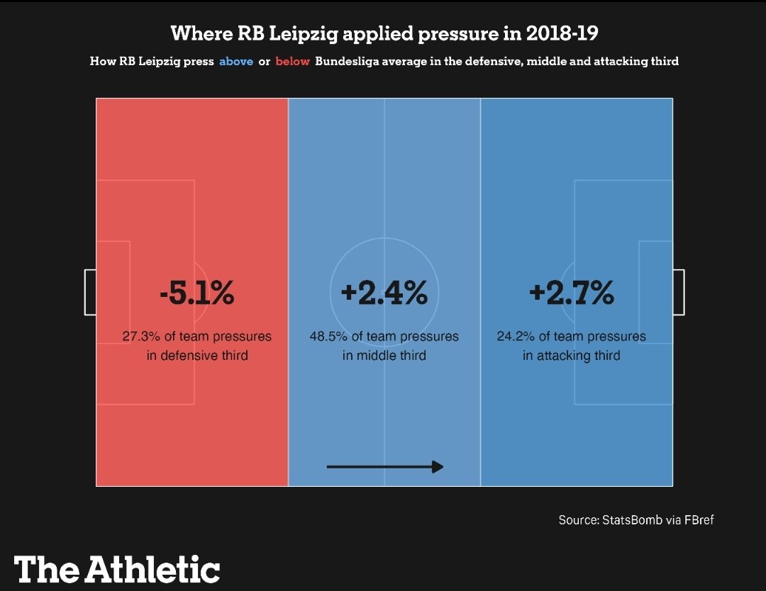 وبهذا المقياس، كان لايبزيغ رانغنيك ذا حدةٍ كبيرة بوضوح - فنجد أن فريقين فقط ضغطا بحدةٍ أكبر في البوندسليغا ذلك الموسم - لكن ليس على مستوى قاعدة البيانات ككل فنجد أن فريقه يحتل المئين الـ 86 في أوروبا على مدار الخمس سنوات الماضية.