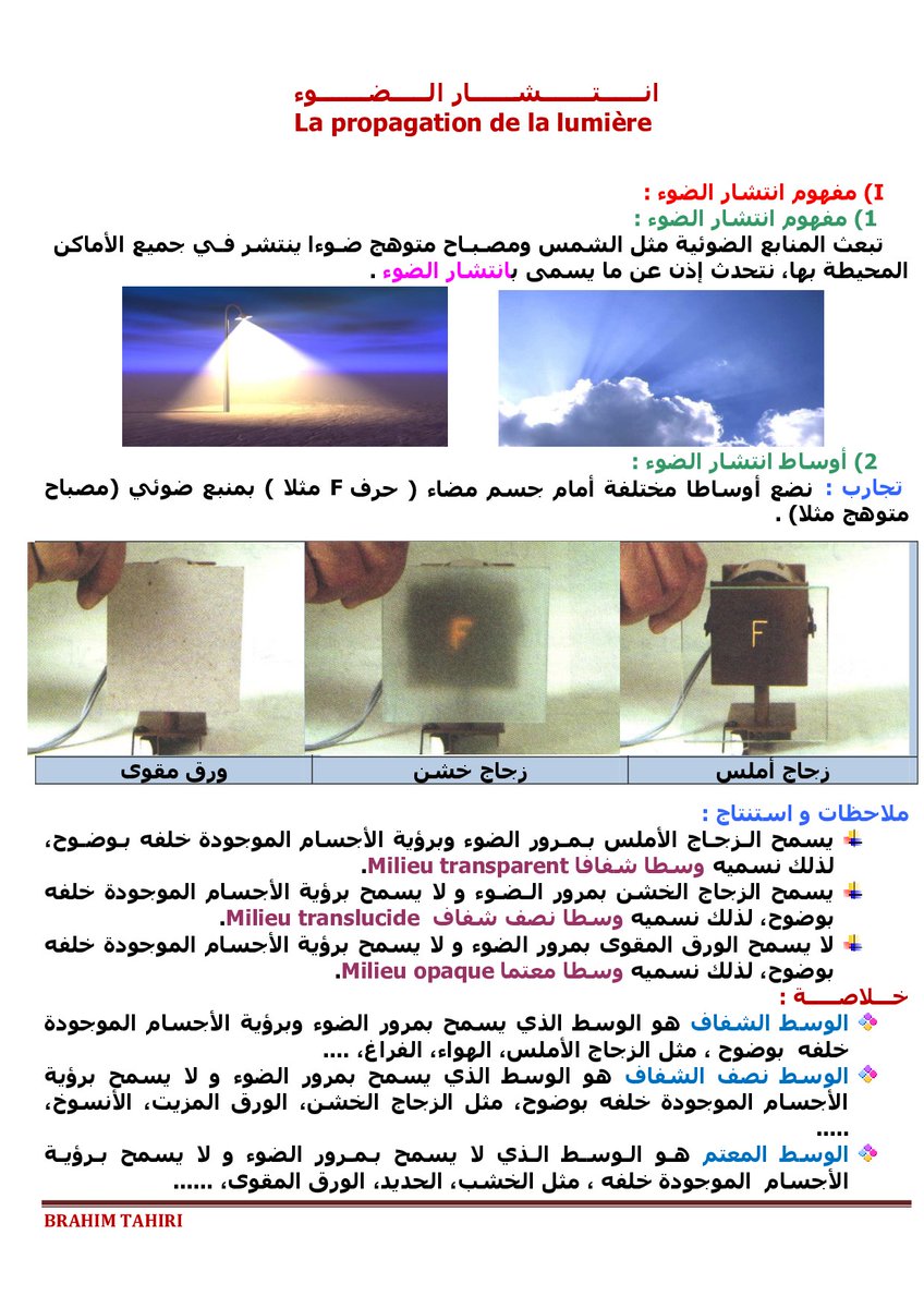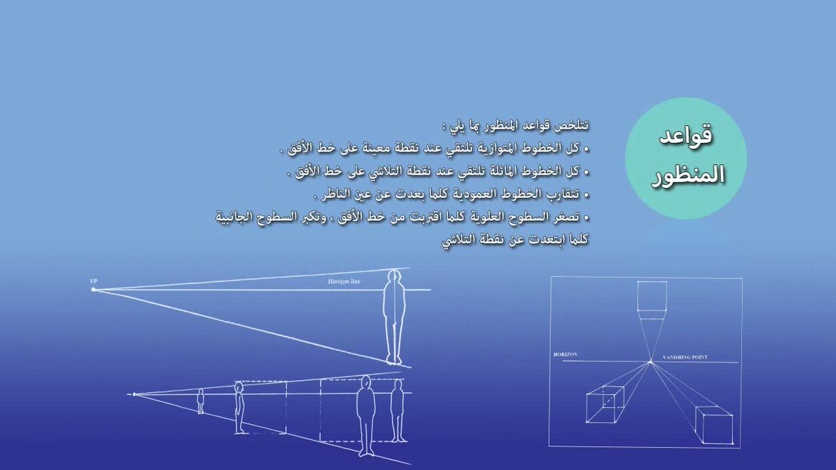 المنظور، نقطة التلاشي أو الهروب، نقطة الزوال، خط الأفق، التعديس الجوي، انكسار الضوء، نفاذية الضوء، الخطوط الافقية والعمودية والجانبية، السراب، حيود الضوء