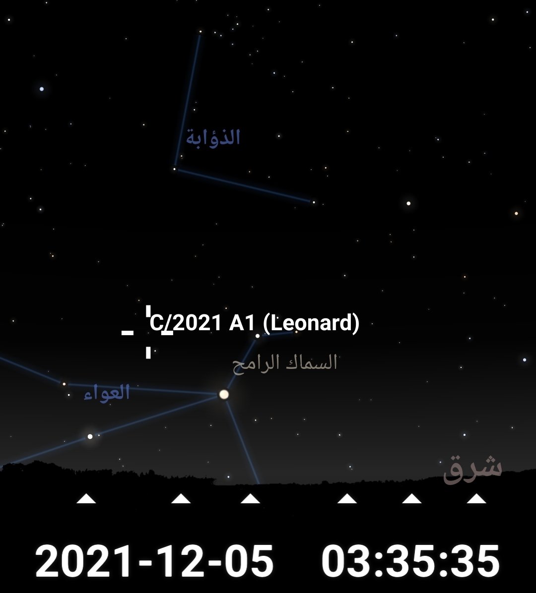 فمن المتوقع ان يصل مذنبC/2021 A1 Leonard لأقرب نقطة من الأرض في 13ديسمبر على مسافة35،005،384كم وهي مسافة آمنة بأذن الله، وقد تصل ذروة سطوعه من 10الى 13ديسمبر الىmgs 6+ أي ربما يكون مشاهد بالمناظير ولا يرى بالعين المجردة ولكن هذا الامر غير مؤكد حتى الان لأنه قد يزداد سطوعه اكثر🔥