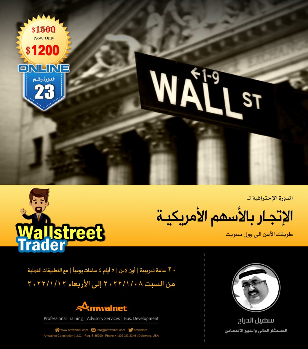 شعار أول دورة لـ #تجارة_الاوبشن باللغة العربية، والدورة هي خلاصة علم وخبرة امتد لأكثر من 22 عاماً في أسواق الأسهم الأمريكية، سهيل الدراج هو أول من ادخل تجارة الأوبشن للوطن العربي، اكثر من 3000 متدرب، لتفاصيل أكثر يرجى الاطلاع على النشرة التعريفية هنا : bit.ly