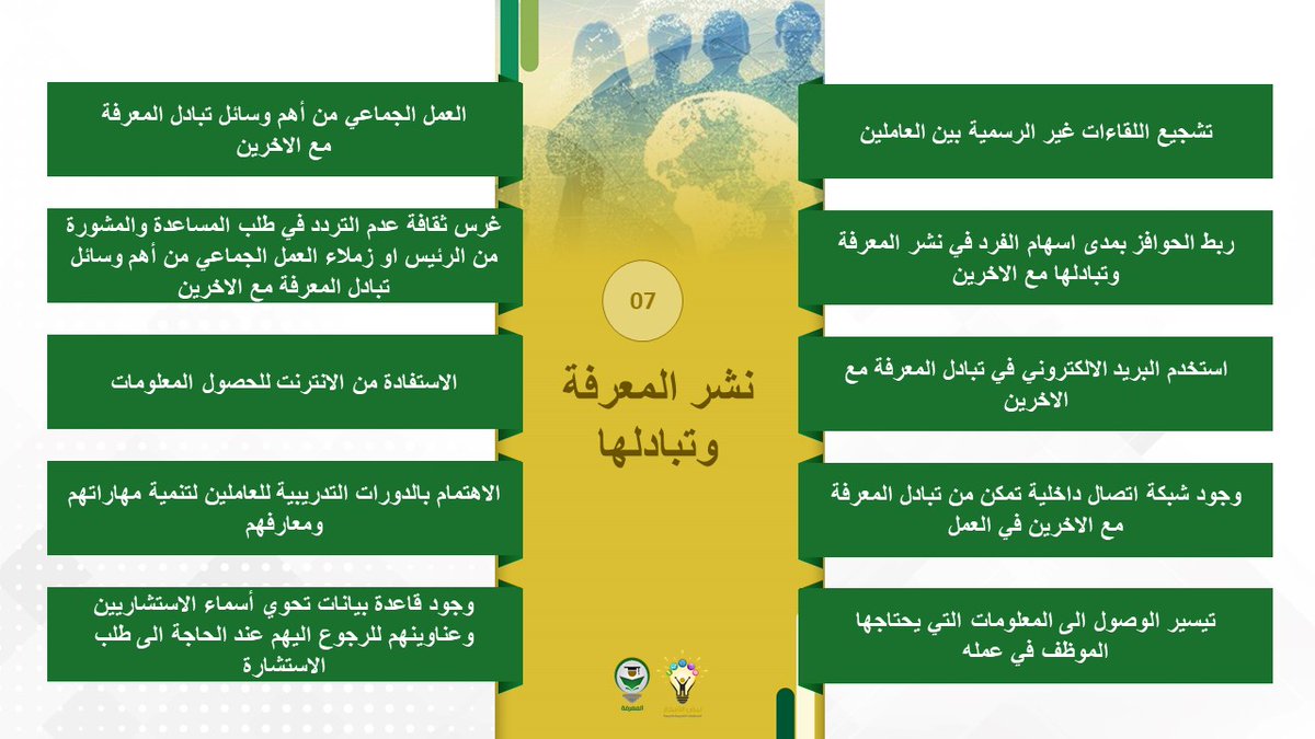 7. غرس ثقافة عدم التردد في طلب المساعدة والمشورة من الرئيس او زملاء العمل الجماعي من أهم وسائل تبادل المعرفة مع الاخرين