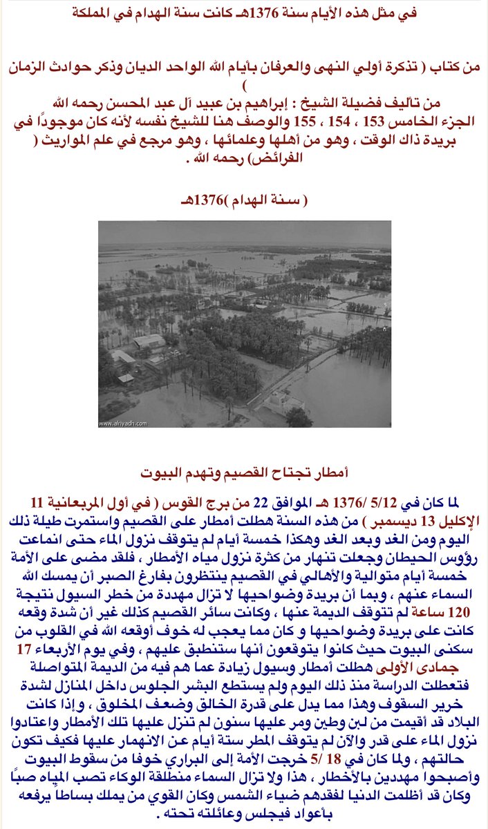 في عام 1956 م وفي مثل هذه الأيام التي تصادف بداية المربعانية كانت بداية حالة فيضانية واسعة استمرت حول الشهرين قوتها وسط المملكة