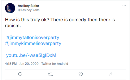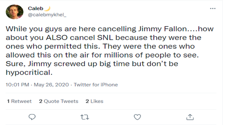 قبل أكثر من عام وتحديداً 26/05/2020 أعاد تويتر حساباً يحمل اسم المستخدم @chefboyohdear نشر فيديو مثيراً للجدل لمقدم برنامج Saturday Night Live الكوميدي جيمي فالون.