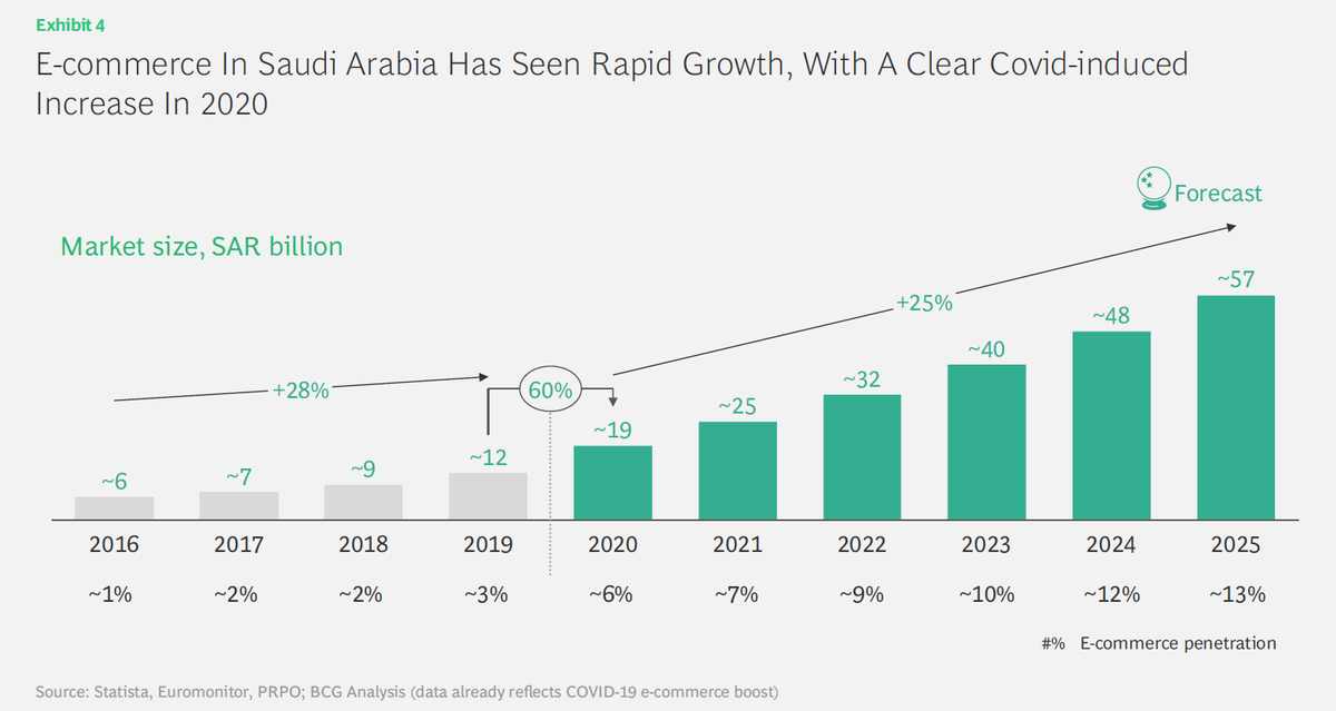 والسعودية- وضعها استثنائي لاغتنام هذه الفرصة إذا استطاعت تقوية البنية التحتية للتجارة الإلكترونية داخليا ، ووضعت السياسات المناسبة ، فستكون قائد قوي لدول الخليج العربي "
