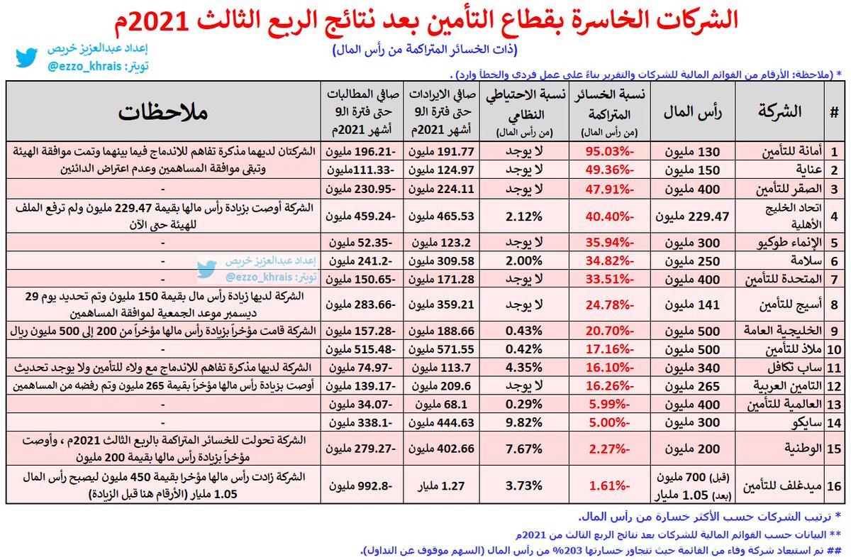 🟥 الشركات الخاسرة في قطاع التأمين 🟥