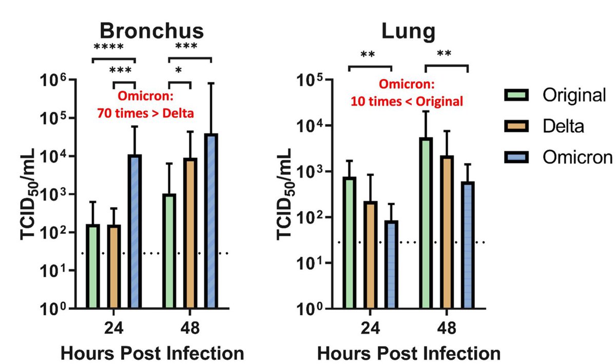 هذه الدراسة بينت أيضاً أن أوميكرون أقل تكاثراً من المتحورات الاخرى في الرئة ب١٠ مرات! خبر جيد جداً وقد يعني هذا انه أقل خطوره من حيث قوة الاعراض ولكن هذه النتائج تحتاج تأكيدات.