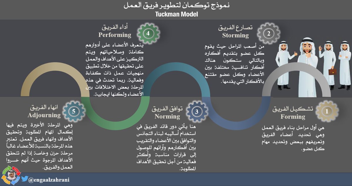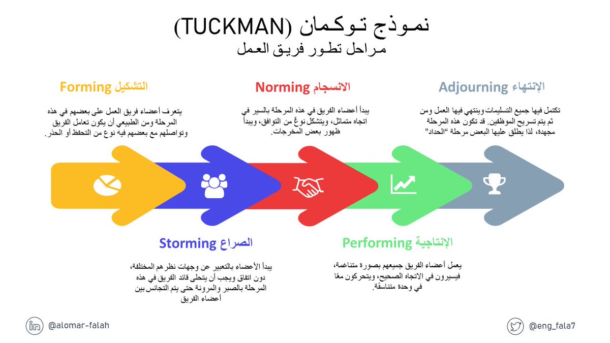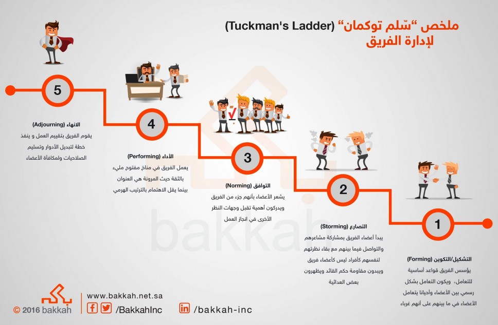 قام “بروس توكمان” بتطوير نموذج تغلب فيه على العقبات التي تواجه بناء فريق العمل، والذي اشتهر باسم "سلم توكمان" حيث يتكون من ٥ مراحل على النحو الاتي:
