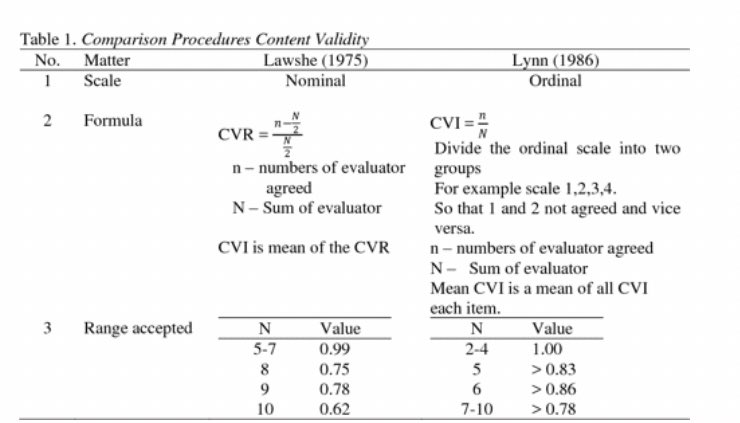 (ملاحظة: يتم الحكم على كل فقرة من خلال المدى المقبول والذي يختلف باختلاف عدد المحكمين وهو موضح في الصورة في الأعلى). بعد ذلك يتم حساب مؤشر صدق المحتوى للمقياس ككل والذي يرمز له بالرمز (S-CVI/Ave) وذلك لحساب المتوسط الحسابي لقيم مؤشرات صدق محتوى جميع فقرات المقياس