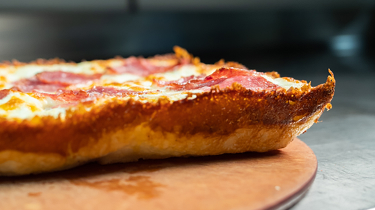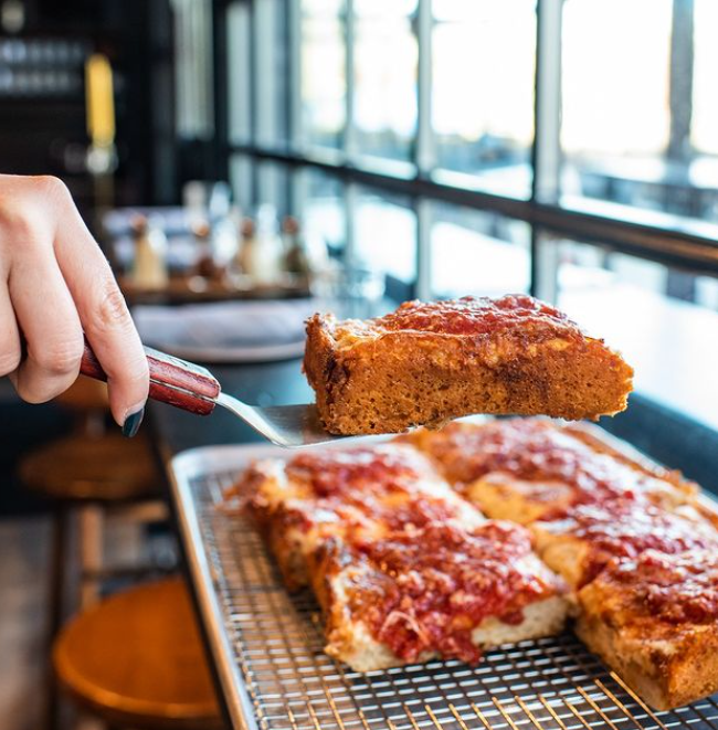 بيتزا على طريقة ديترويت هي بيتزا مستطيلة ذات قشرة سميكة مقرمشة ولذيذة. يتم تزيينها بصلصة الطماطم وجبن ويسكونسن الذي يمتد حتى الأطراف.