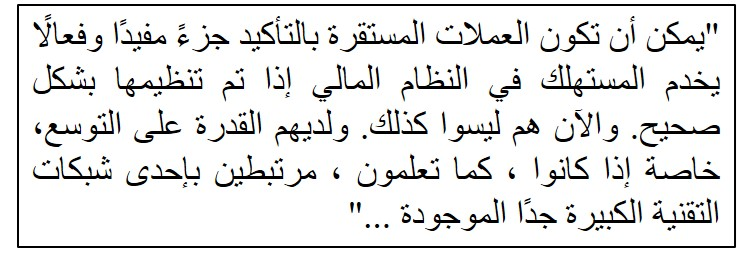 10. فلذلك يود الاحتياطي أن تخضع العملات المستقرة للرقابة النظامية. أما العملات المشفرة، فيبدو أن إجماع الاحتياطي بإنها لا تشكل حاليا خطرا على الاستقرار المالي وهي على كل حال مسؤولية هيئة الأوراق المالية وليس الاحتياطي.