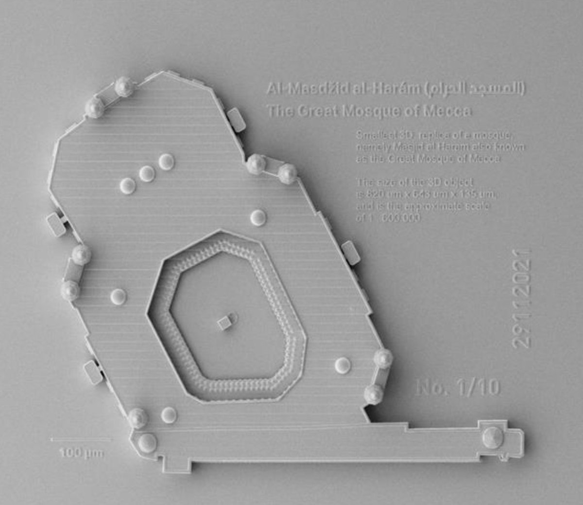 حيث تمت طباعته باستخدام الطباعة الحجرية الدقيقة بدقة 250 نانومتراً، وهو ما يشكل تقريباً مقياس 1: 600000 من واقع المسجد الحرام في مكة المكرمة.
