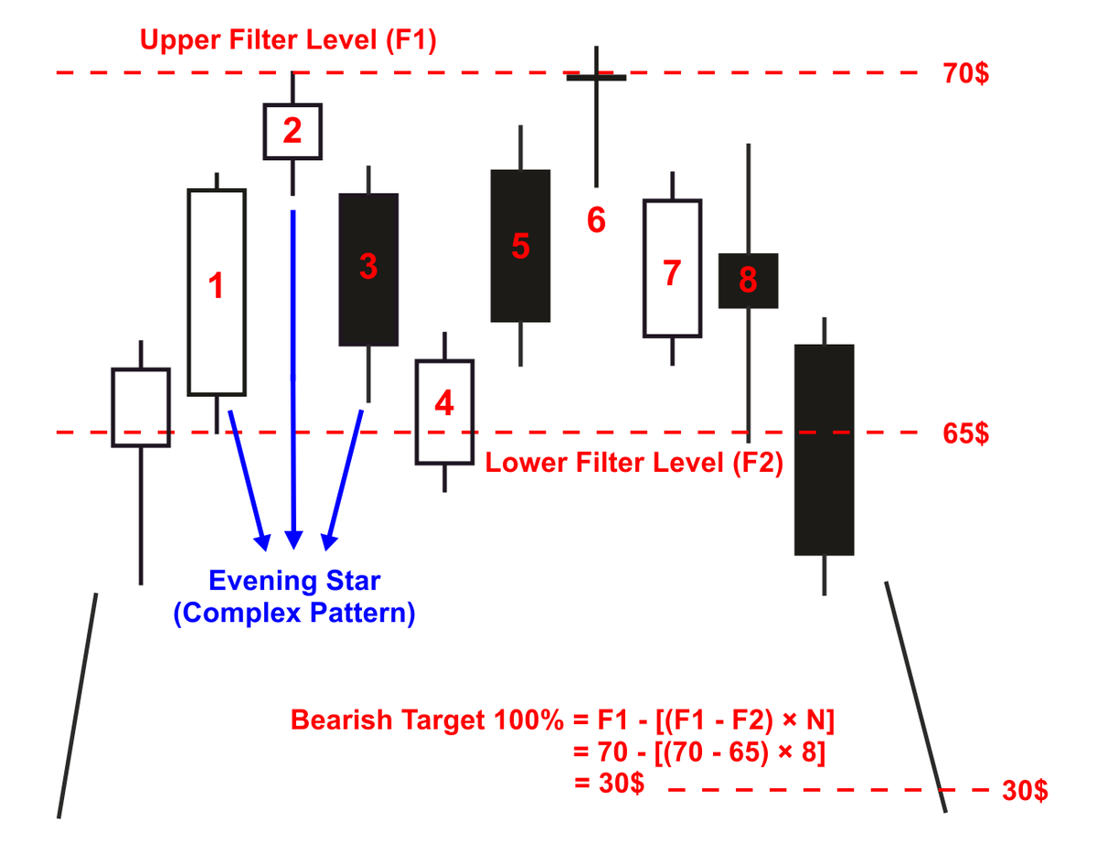 N: عدد الشموع التي أغلقت بين الفلتر العلوي F1 والفلتر السفلي F2، ويشمل ذلك شموع النموذج.