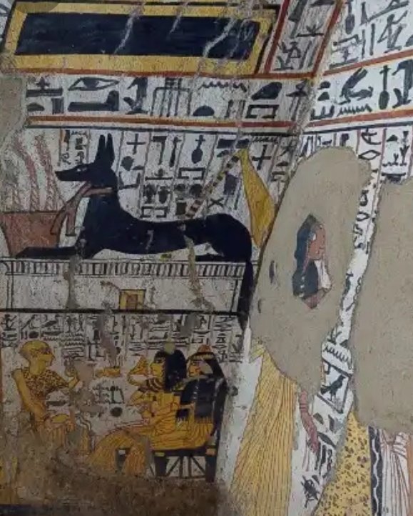 هذا النقش مثلا يجسد حياة الموتى القرود والطيور ترمز الى الفرح بقدوم الشمس (الشمس - الاله رع) واما الانسان فهو الروح الي ماتت.. القسم الاسفل هم زوار هذا الميت واله.. اما الكلمات الهيرو كلها تعويذات وخرابيط لتسهيل الانتقال للعالم السفلي