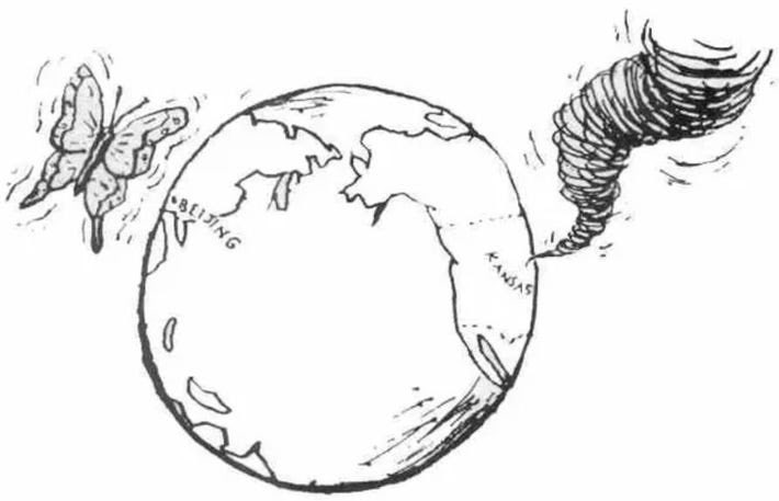 من هنا ظهر تأثير الفراشة، وهو ما ينص على أن حركة جناحي الفراشة أثناء طيرانها قادرة على إحداث تغييرات بسيطة في حالة الطقس