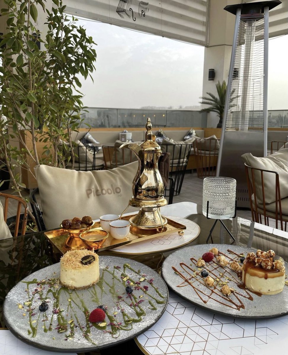 من القهاوي الي تقدم قهوة عربية وحلوياتهم سعودية تقديمها أنيق وخيارات الحلى كثيرة وخصوصا الحلويات الشتوية