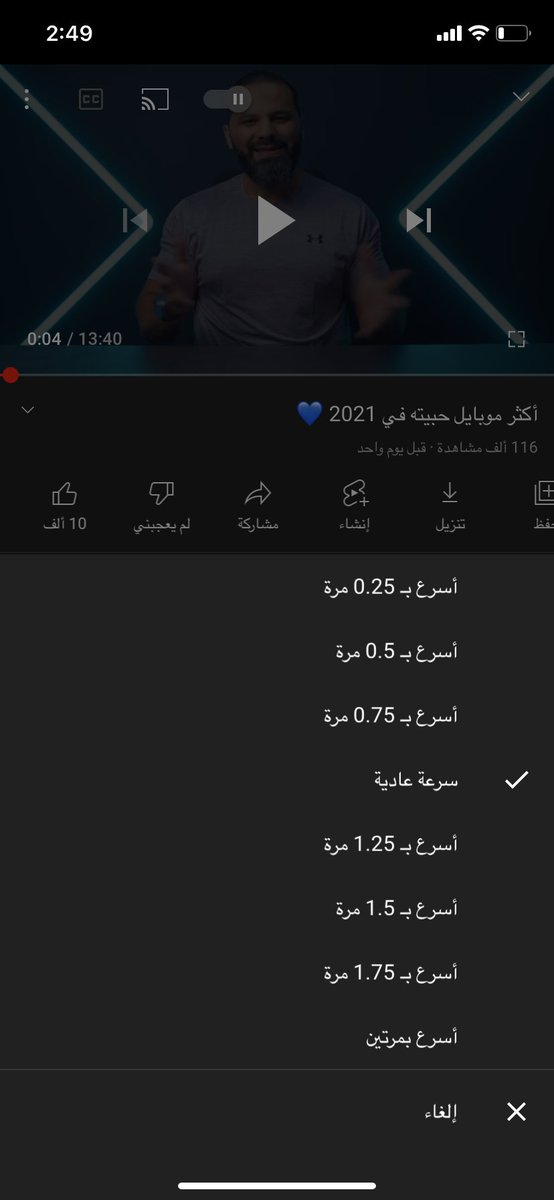 10- تغيير سرعة عرض مقطع الفيديو الذي تشاهده حيث يمكنك زيادتها أو خفضها حسب تفضيلك