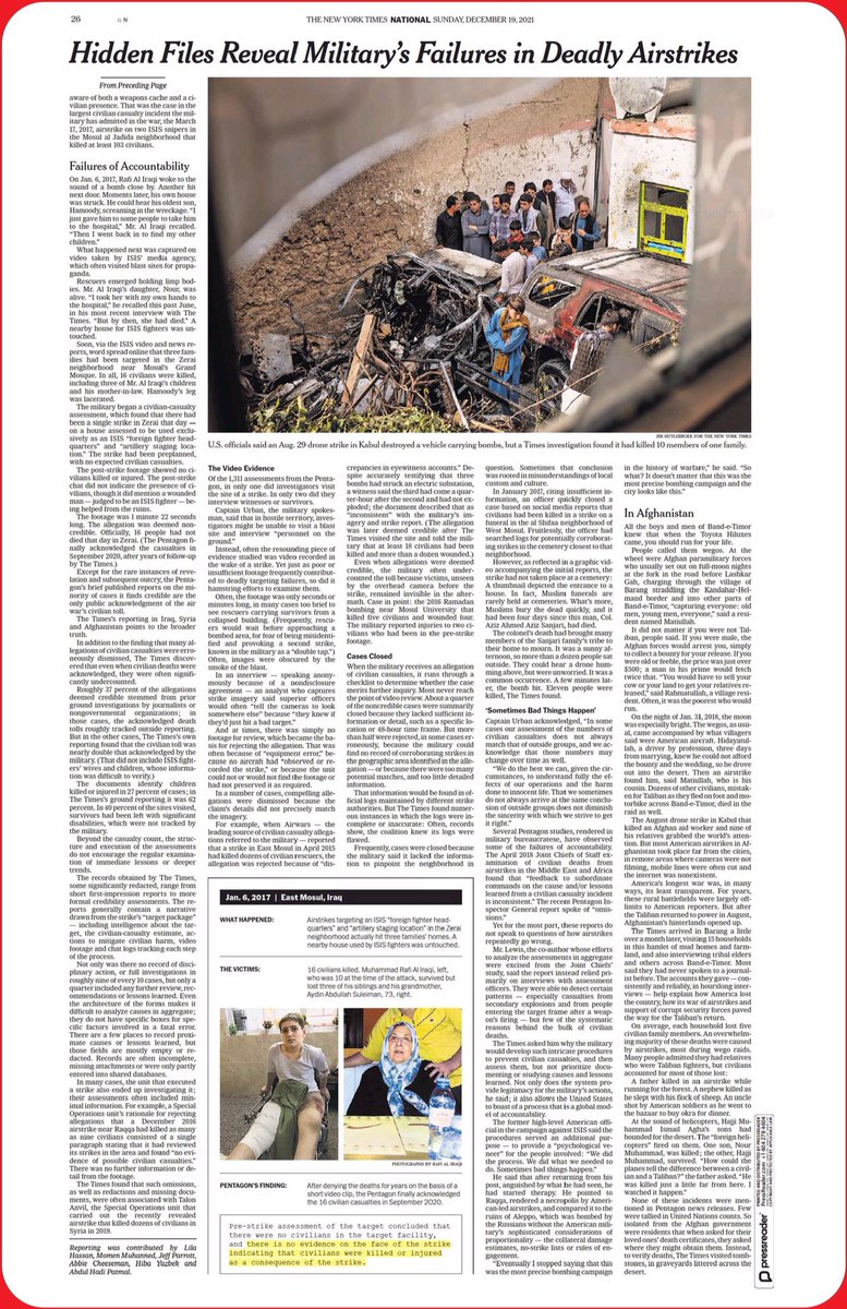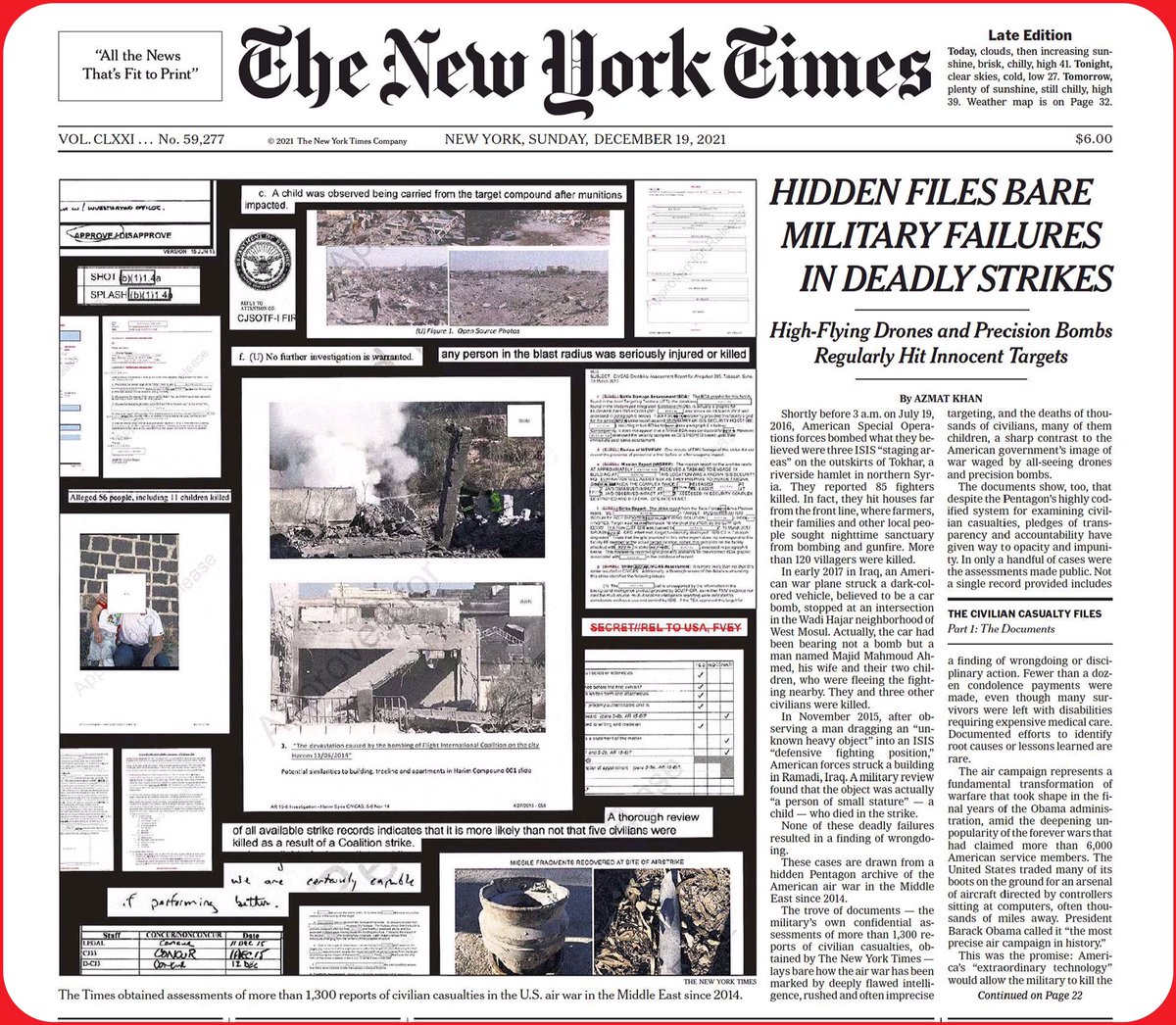 كشفت صحيفة نيويورك تايمز عن وثائق حصلت عليها من البنتاجون الأمريكي تظهر جانبا مظلما من حروب #الولايات_المتحدة الجوية في الشرق الأوسط منذ عام 2014 توثق عمليات قتل لآلاف المدنيين، تقول أنها عمليات استخباراتية فاشلة !!