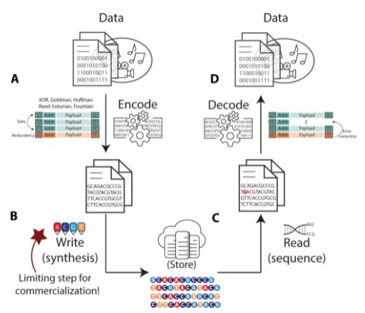 وبالنظر إلى أبحاث معهد جورجيا التقني Georgia Tech Research Institute نرى أن العمل جارٍ على قدم وساق لصنع شريحة لتخزين الحمض النووي الاصطناعي بكثافة عالية (سعة تخزينية أكبر)، هذه الخطوة ستساهم في خفض التكاليف الباهظة لهذه العملية المعقدّة.