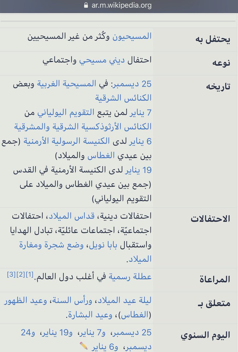 ٤- علمًا أن بعض طوائف النصارى كالأرمن يحتفلون بالكريسمس في ٧ يناير لاختلاف التقويم الذي يعملون به، فيكون ٧ يناير موافقاً عندهم ليوم 25 ديسمبر، وبعضهم يحتفل به في أيام أخرى!!