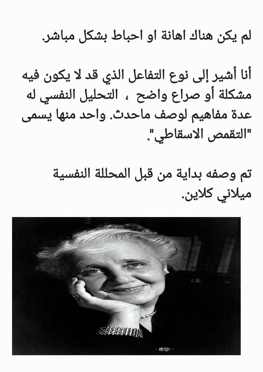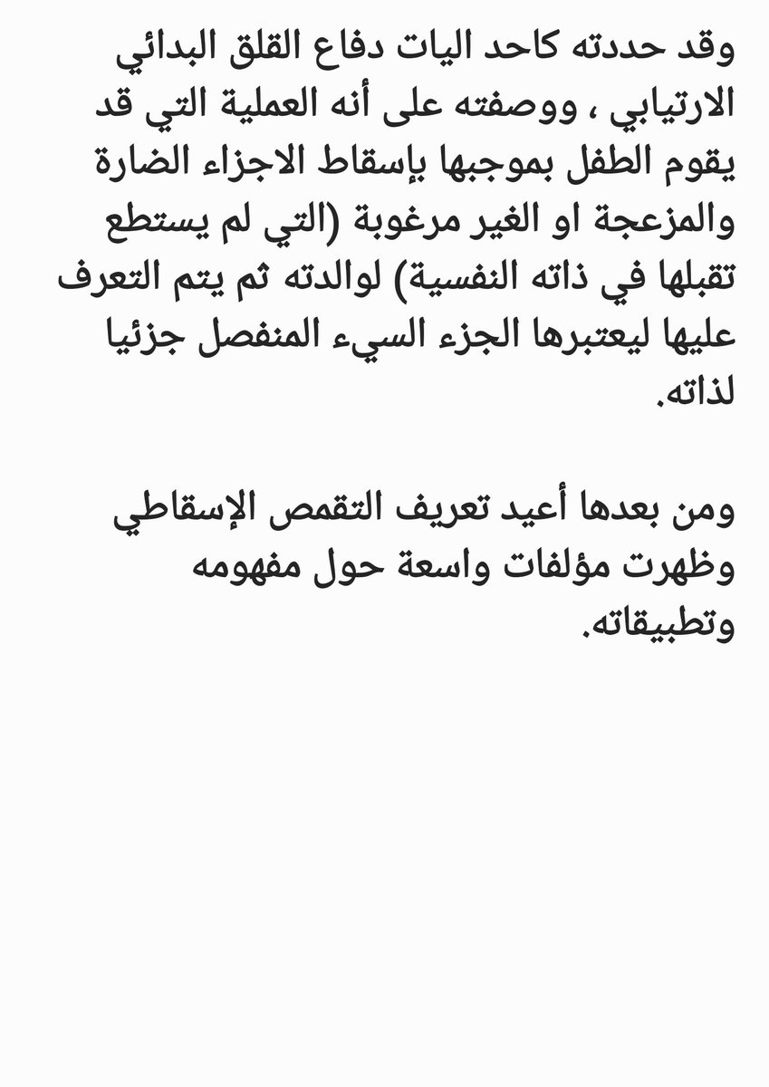 وقد حددته كاحد اليات دفاع القلق البدائي الارتيابي ، ووصفته على أنه العملية التي قد يقوم الطفل بموجبها بإسقاط الاجزاء الضارة والمزعجة او الغير مرغوبة (التي لم يستطع تقبلها في ذاته النفسية) لوالدته ثم يتم التعرف عليها ليعتبرها الجزء السيء المنفصل جزئيا لذاته.