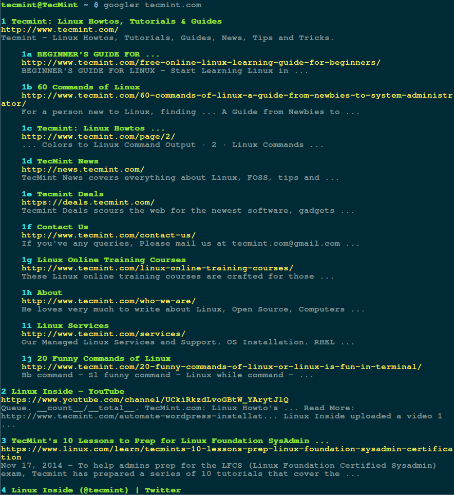 فيما يلي بعض الأمثلة التي توضح كيفية عمل Googler في Linux ، سيعرض الأمر الأساسي أدناه معلومات حول tecmint.com: