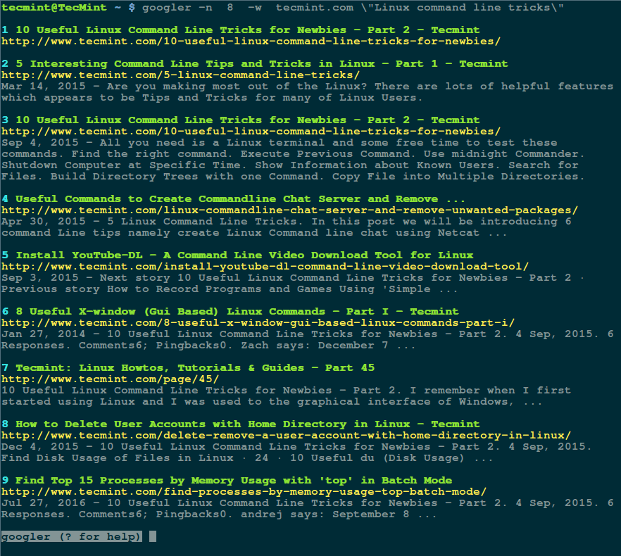 $ googler -n 8 -w tecmint.com \"Linux command line tricks\"