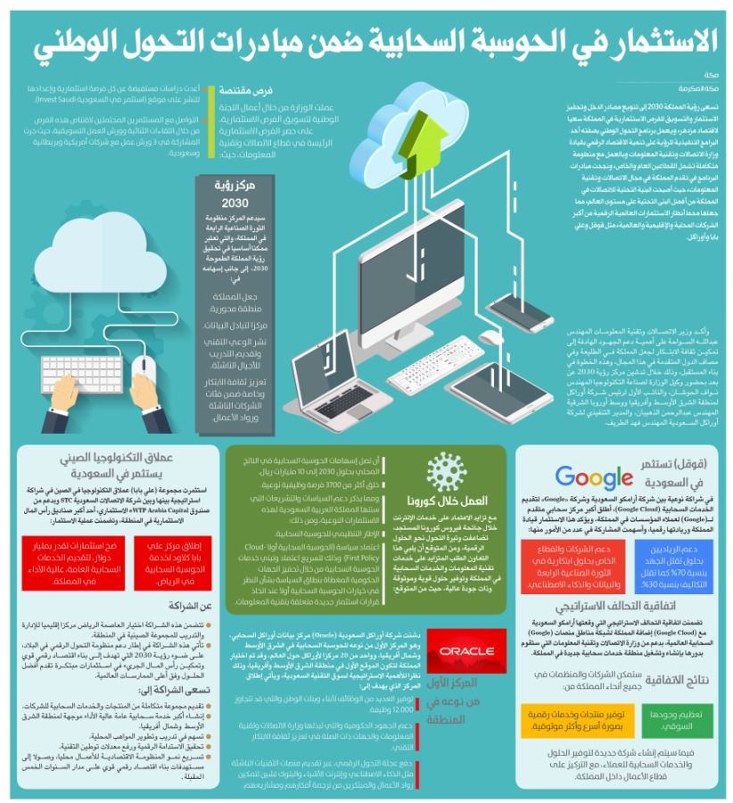 بينما تعد #الحوسبة_السحابية بمثابة المحرك التكنولوجي الأساسي لمبادرات التحول الرقمي في المملكة العربية السعودية، فمن المؤكد أنها من تقود الثورة الرقمية في الوقت الحالي، كونها تلعب دورًا أساسي في تحقيق أهداف "رؤية المملكة 2030"