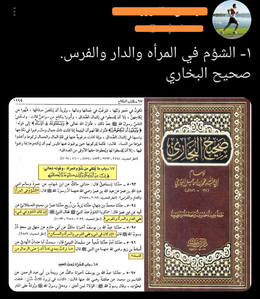 ١. الشؤم في المرأة والدّار والفرس هذا النّكراني يزعم باطلًا أن السنّة النبوية المُطهّرة أساءت للمرأة ووصفتها بأنها شؤم. قبل أن نرد على كلامه التّىافه، دعونا نرى أحاديث أخرى لم يأتِ بها هذا النّكراني إمّا جهلًا منه، أو خىبثًا وتدليىسًا منه لكي يطعن بالسنّة النبويّة المُطهّرة.