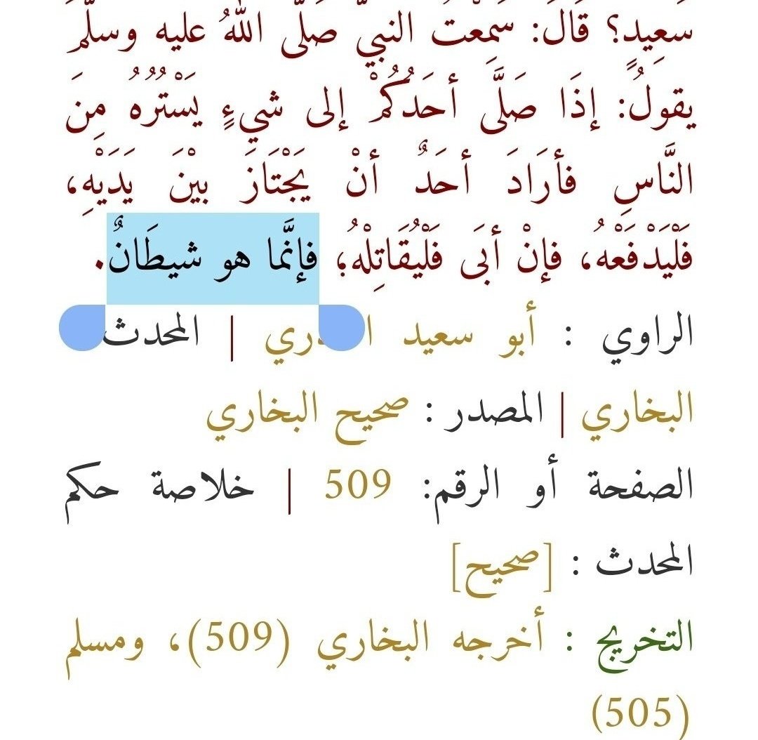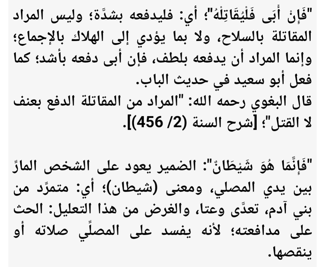 يتكلم عن الرجل الذي يمر أمام المصلي، فينبغي على المسلم أن يدفعه بلطف، فإن أبى فليدفعه بشده، لأنه شيطان. والشيطان يعود على الشخص المار بين يدي المصلي، ويعني أنه متمرّد من بني آدم، لأنه ينقص من أجر الصلاة .