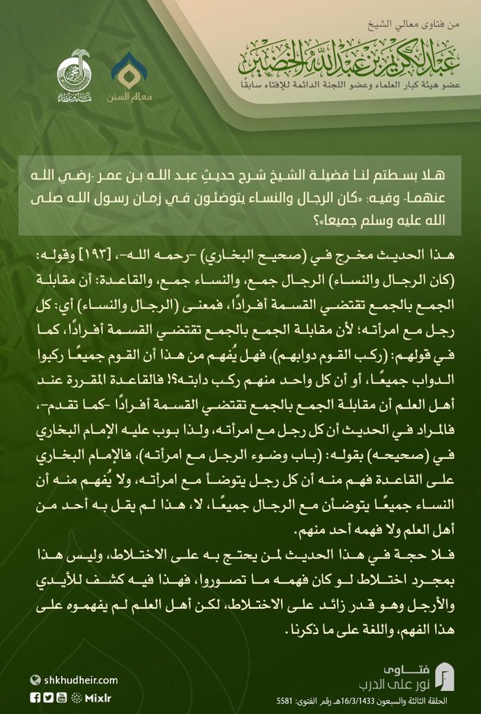 هلا بسطتم لنا فضيلة الشيخ شرح حديثِ عبد الله بن عمر -رضي الله عنهما- وفيه: «كان الرجال والنساء يتوضئون في زمان رسول الله صلى الله عليه وسلم جميعا»؟