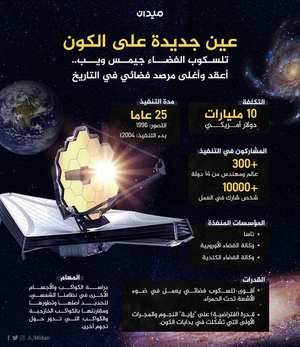 أخطر تلسكوب فضائي صُنع بواسطة ناسا، ووكالتي الفضاء الأوروبية والكندية، تبلغ تكلفته نحو 10 مليار دولار، واستغرق العمل به نحو 30 سنة‼️