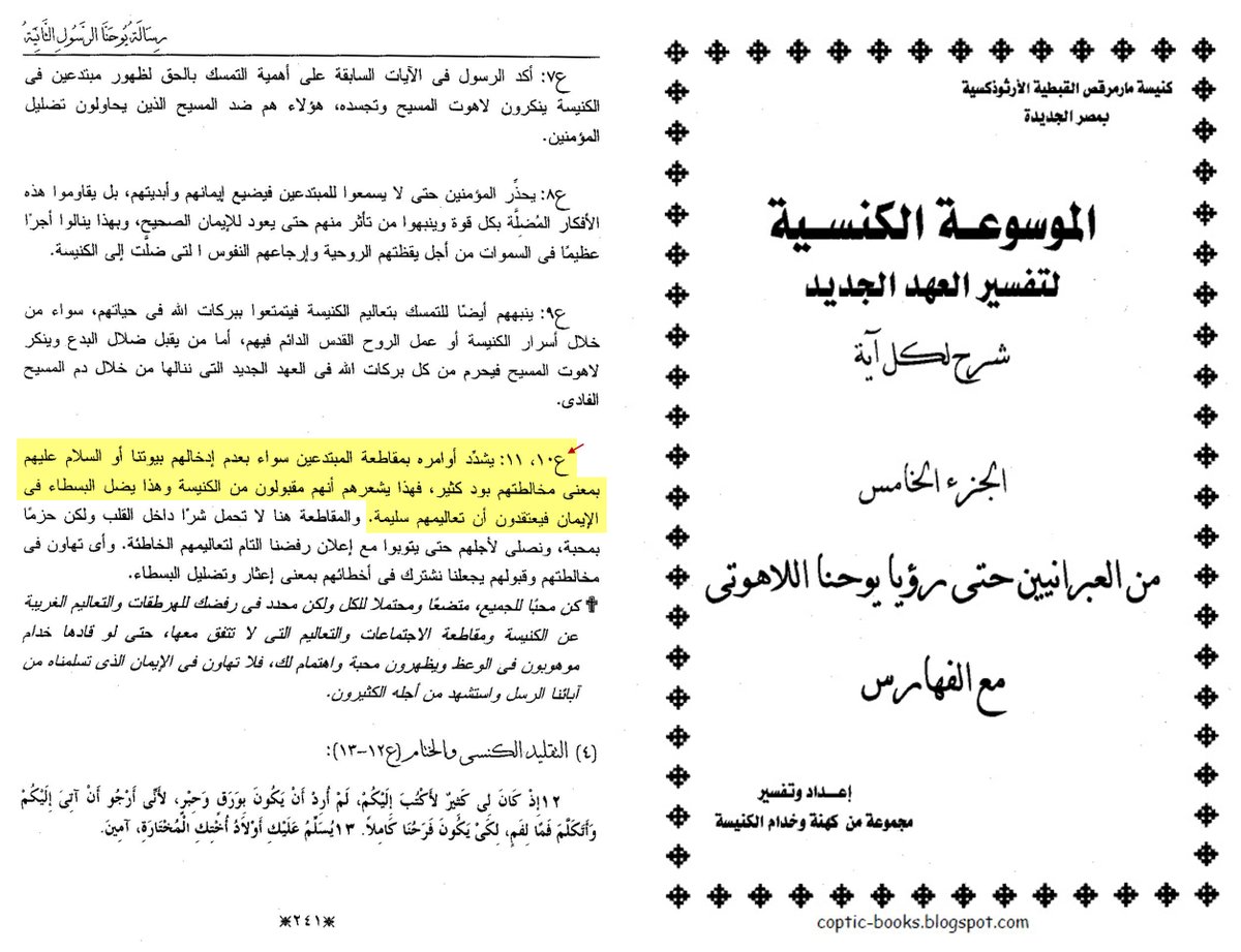 (( إن كان أحد يأتيكم، ولا يجيء بهذا التعليم، فلا تقبلوه في البيت، ولا تقولوا له سلام ))(2 يو 1: 10)