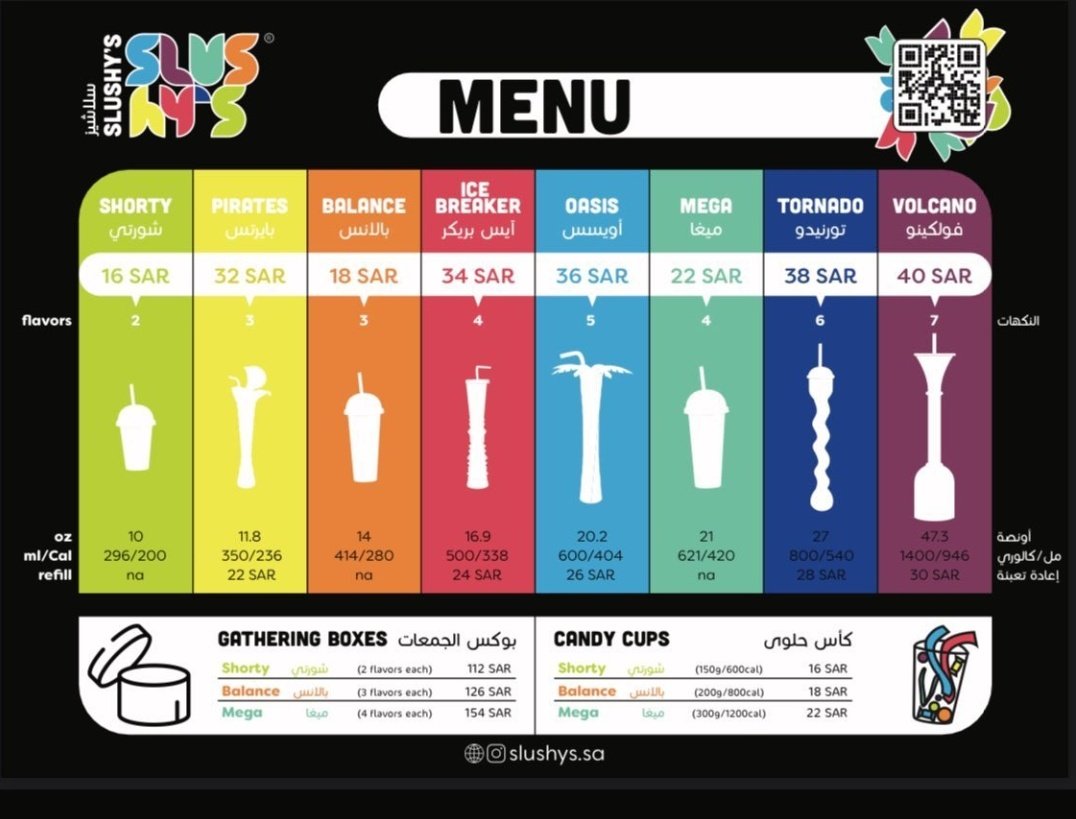 يقدم مشروب السلاش اللي له شعبيه كبيرة من مختلف الأعمار و خاصةً الأطفال يقدمها بطريقة مبتكرة جميلة و جذابة و بنكهات متعددة.