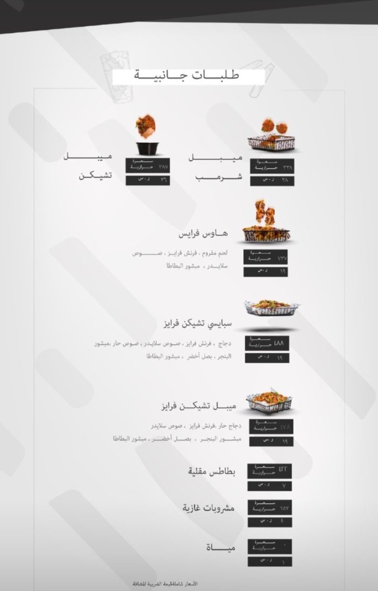 و يقدم بعض الأصناف الجانبيه مثل أجنحة الدجاج بنكهات و طرق مختلفة و الدجاج الفيليه المقلي.