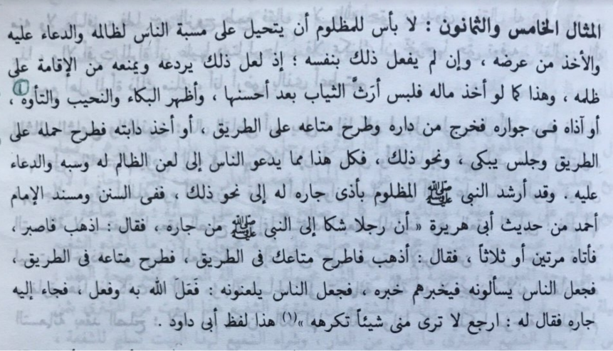 هو ينتصر لنفسه ويعاقب الجار السيء بالتشهير والضغط المجتمعي بطريقة ذكية وهذه حيلة مقبولة وفيها مصلحة مشروعة .. وتحدثنا عنها سابقاً في الحيل على المصالح المشروعة .. الحيل التي تتجاوز فيه بعض العقبات القضائية والأصول الغالبة التي تعترض وصولك لحقك المشروع .. وسأرفقها لكم للفائدة ..