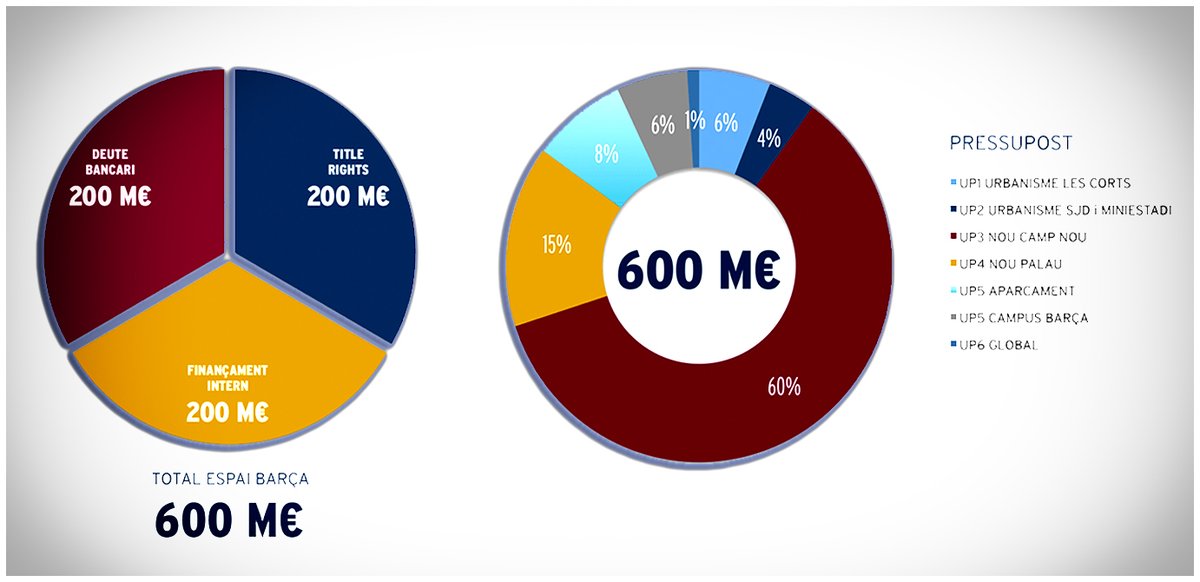 - 420 مليون يورو لتجديد ملعب كامب نو ، 90 مليون يورو لبناء الصالة المغطاة الجديدة ، 40 مليون يورو لبناء مواقف سيارات جديدة ، 20 مليون يورو لترميم البنية التحتية 👇