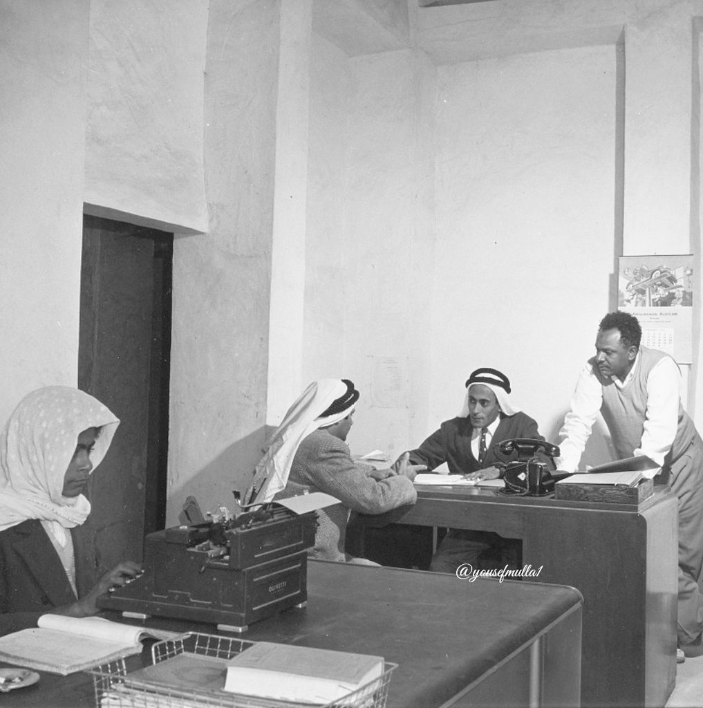 4️⃣ رجل الأعمال عبدالله فؤاد رحمه الله (عمره آنذاك 25 عاما) يناقش العمل مع رئيس المترجمين في مكتب الترجمة في الدمام، عام 1950م.