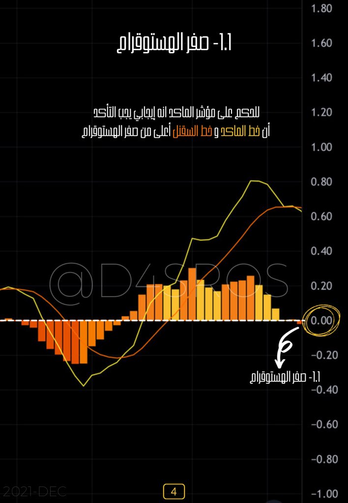 بقاء خط الماكد والسقنل فوق صفر الهستوقرام يعني ان السهم في مسار صاعد ، هبوط خط الماكد والسقنل اسفل صفر الهستوقرام يشير الى ان سعر السهم سوف يسلك مسارًا هابطًا🔻