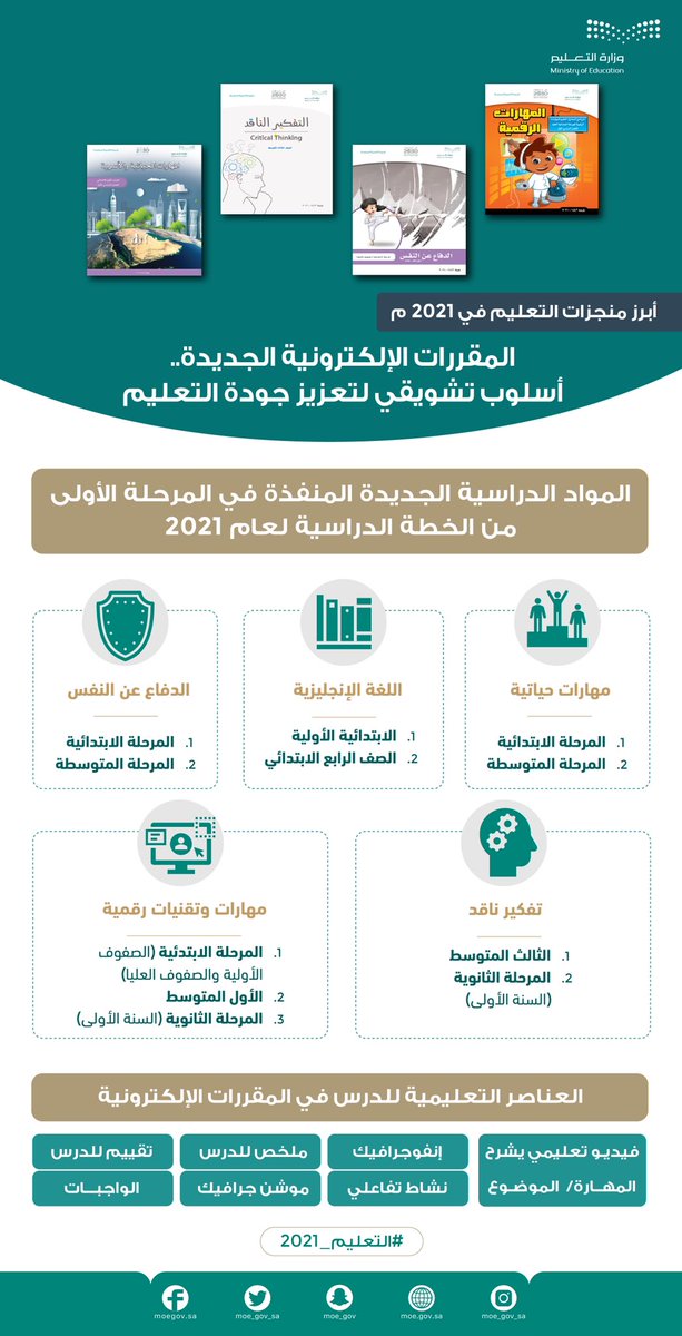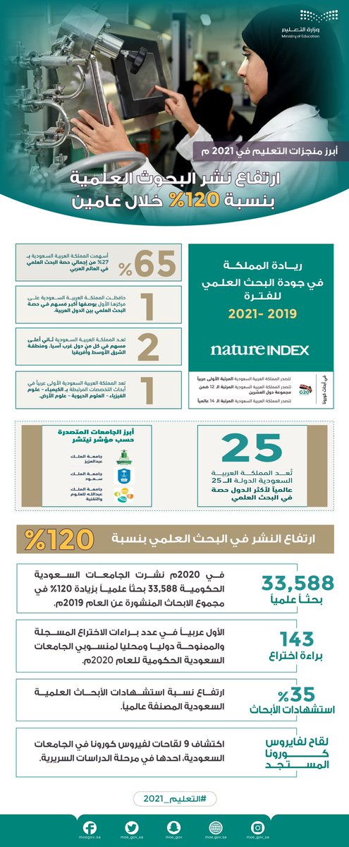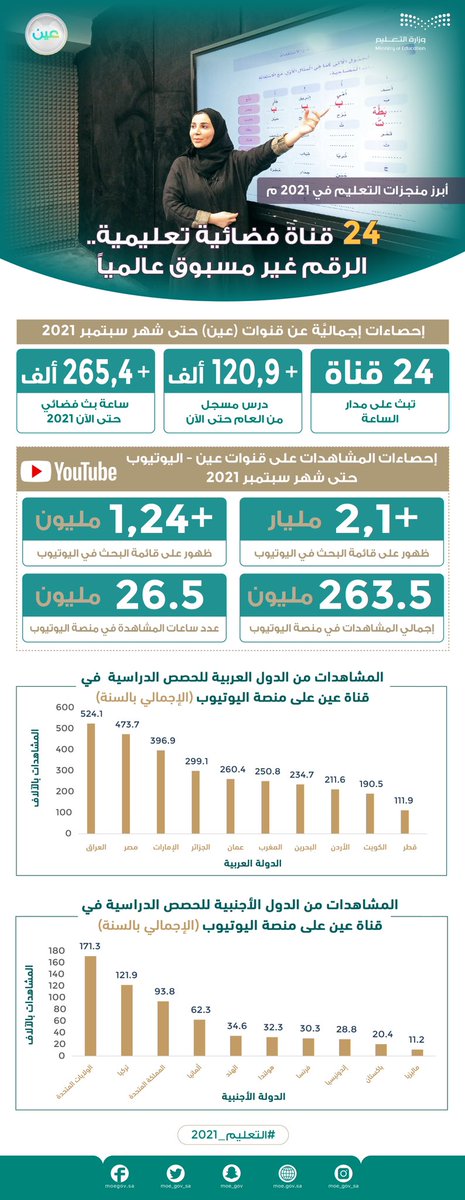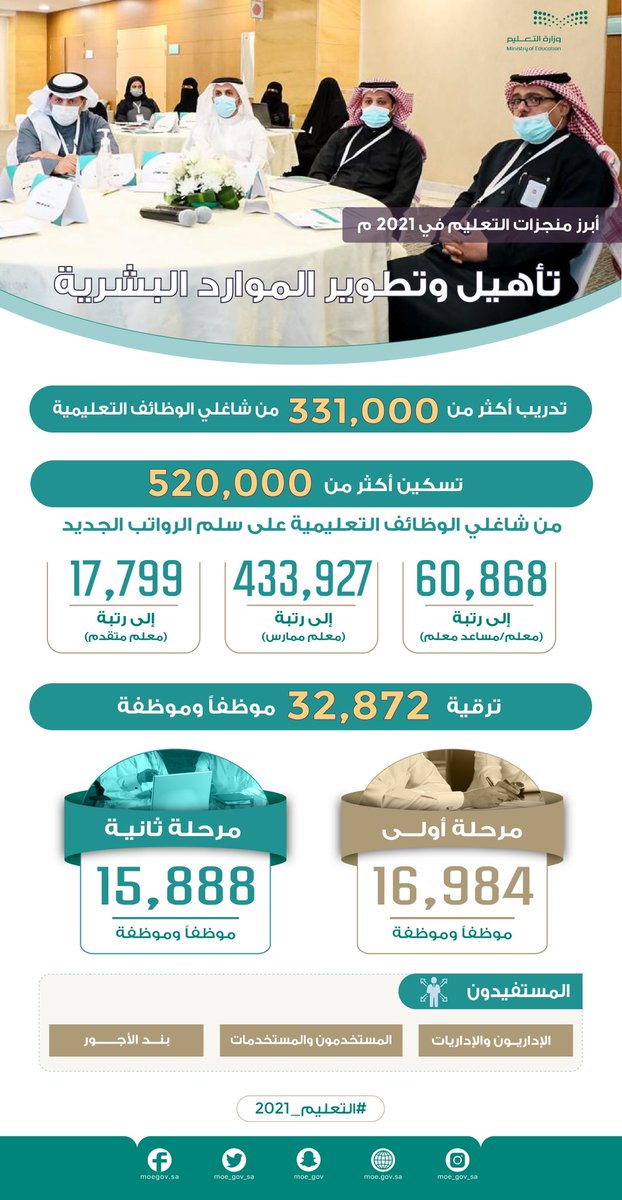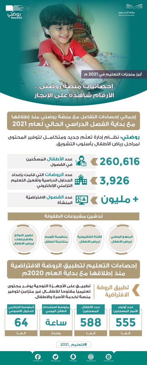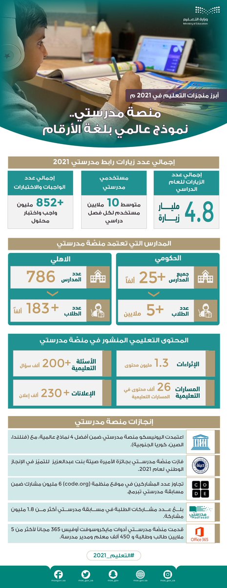 بدعم وتوجيه القيادة الرشيدة -حفظها الله-؛ حقق #التعليم منجزات نوعية في عام 2021، لإعداد إنسان المستقبل، والمساهمة في التنمية الوطنية الشاملة، وتعزيز موقع المملكة في التنافسية العالمية؛ وفق رؤية 2030.
