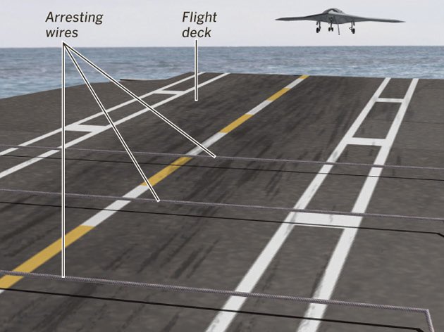اما بالنسبة لمسافة الهبوط فمن المستحيل أن تهبط الطائرة وتتباطأ من سرعة ٢٠٠ الى ٠ في مسافة مدرج حاملة الطائرات لذلك فإن الحاملات مزودة بأسلاك قوية جدا لإمساك الطائرات وسحبها فور هبوطها وهذه الاسلاك تتولى مهمة ايقاف الطائرة