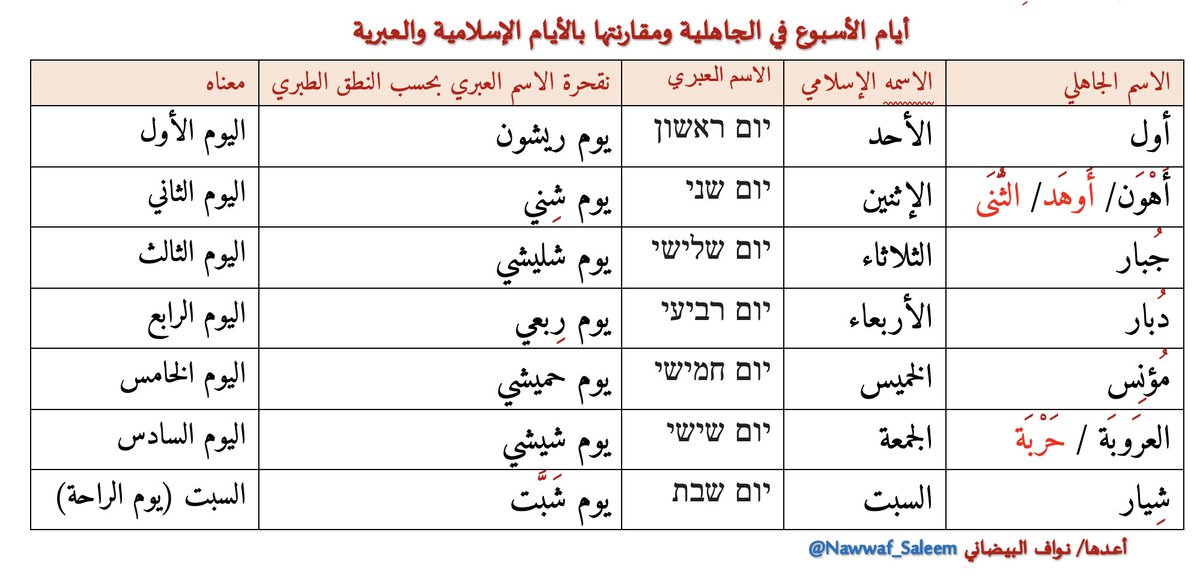 وسموا الثلاثاء "جُبار" لأن العدد جُبِرَ به وقوي، فالأحد 1 فردي والإثنين 2 زوجي والثلاثاء هو الثالث "3" في الترتيب. وسموا الأربعاء "دُبار" لأنه كان آخر العدد في تلك الأسماء، وبه تمّ العقد الأول، ومعلوم أن دُبُر كلّ شيء مؤخره.